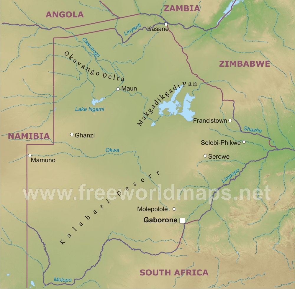 Principal rivers are the Okawango, Molopo, Okwa, Limpopo and Shashe.Gaborone is the country's capital, other important cities include Molepolole, Kasane, Maun, Francistown, Selebi-Phikwe, Serowe, Ghanzi, Mamuno.