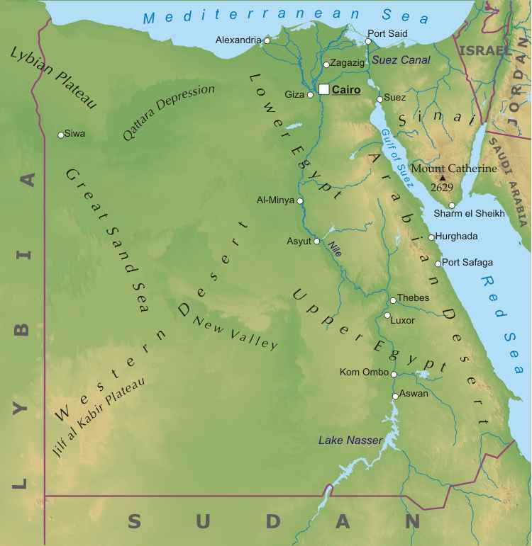 About ninety per cent of the country is desert: the Western Desert, a continuation of the Sahara Desert and the Eastern Desert. The deserts are separated by the Nile which flows from the Sudan and through the length of Egypt to the Mediterranean Sea. The remainder of the country consists of the Nile Valley Delta and Sinai.Mount Catherine (Jabal Katrinah) is the country's highest point at 2629 meters above sea level.