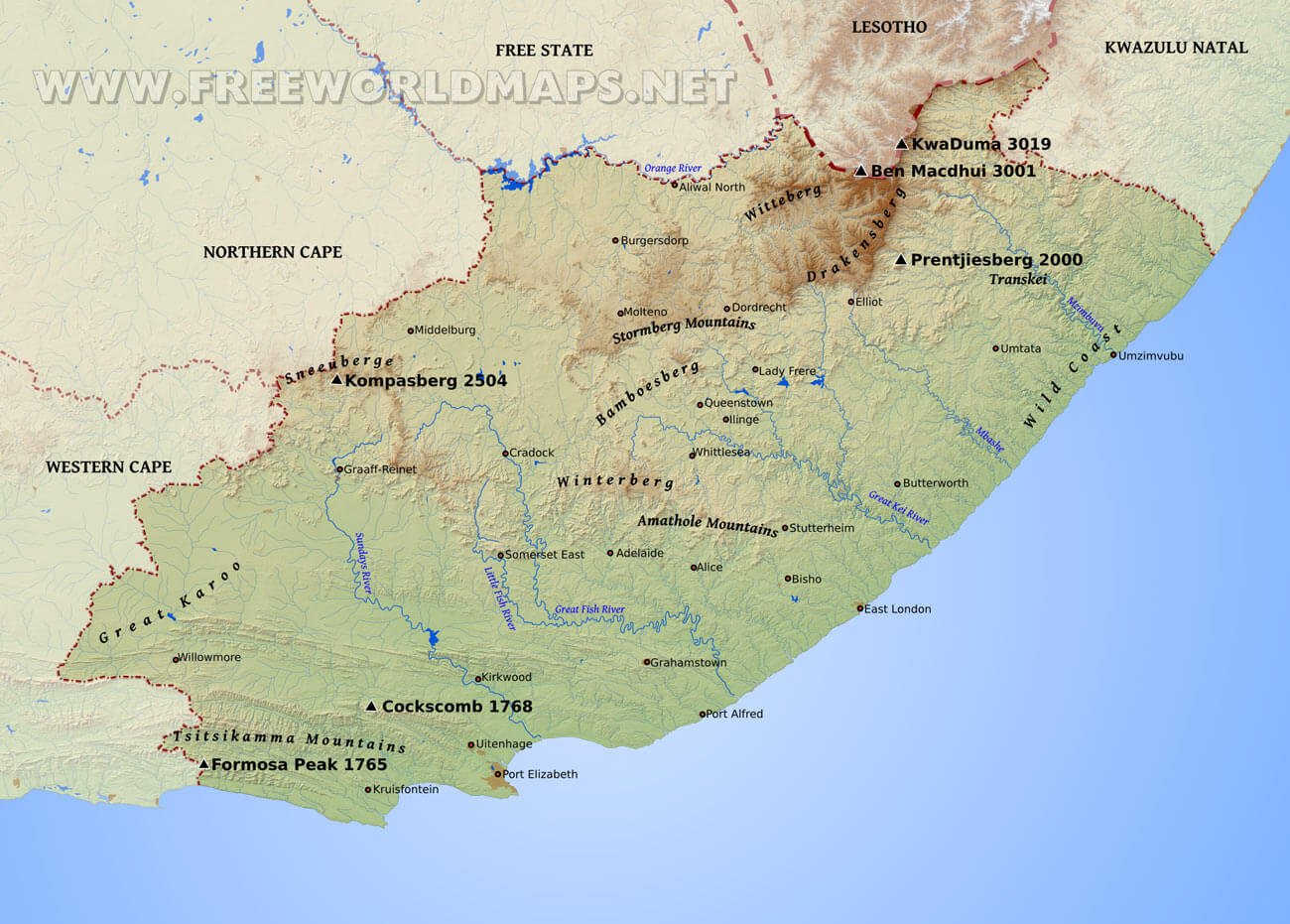 Great Fish River, Little Fish River, Sundays River, Great Kei River, Mbashe, Mzimbuvu, Orange RiverMountains, regions: