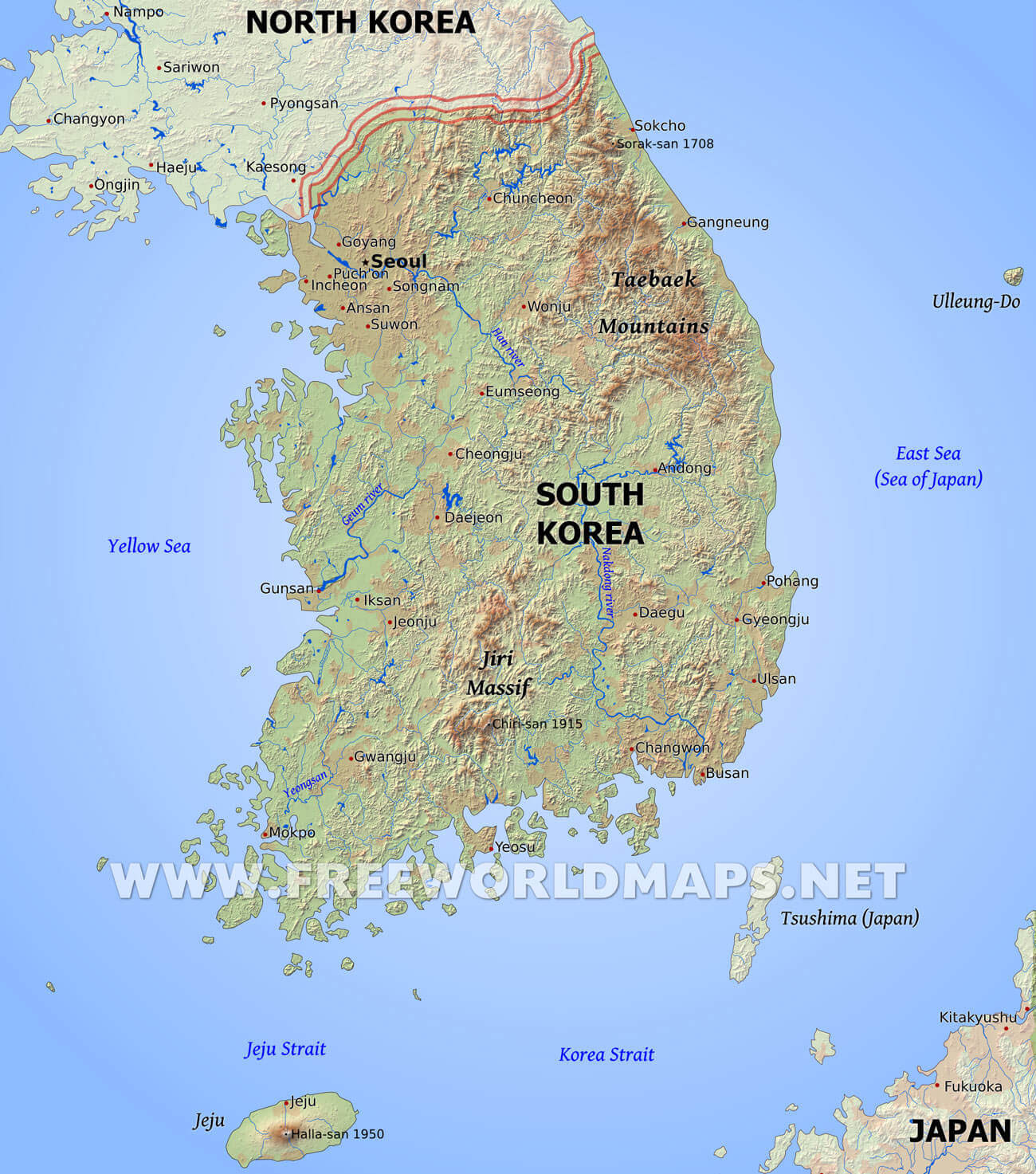 The landscape is characterized by mostly hilly regions in the south and west which will tranform to increasingly higher elevated mountainous sections in the north and east. The Taebaek (Spine of Korea) range runs parallel to the north-to-south directed east coast, while the other dominant range of the country, the Jiri Massif in the southern third of the country, runs northeast-to southwest.