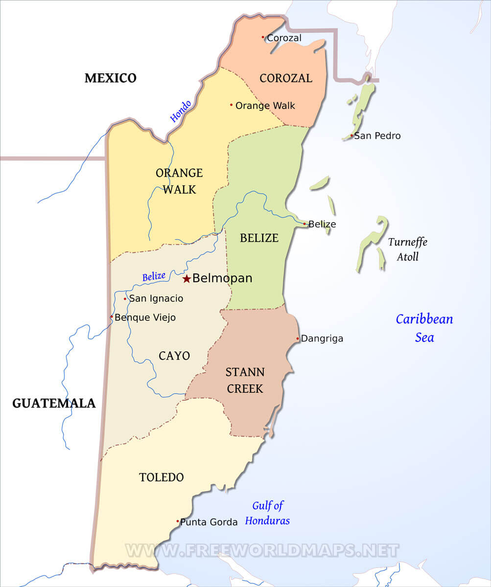 Cities: Belize, Belmopan , Benque Viejo, Corozal, Dangriga, Orange Walk, Punta Gorda, San Ignacio, San Pedro