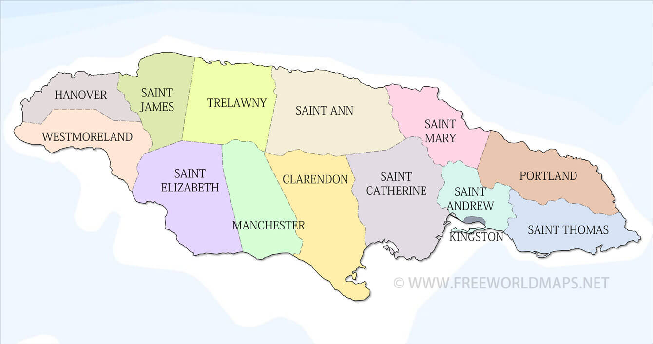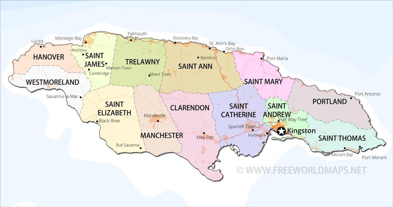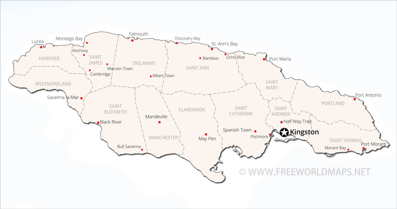 Political map of Jamaica, showing administrative units, cities, and other features of Jamaica