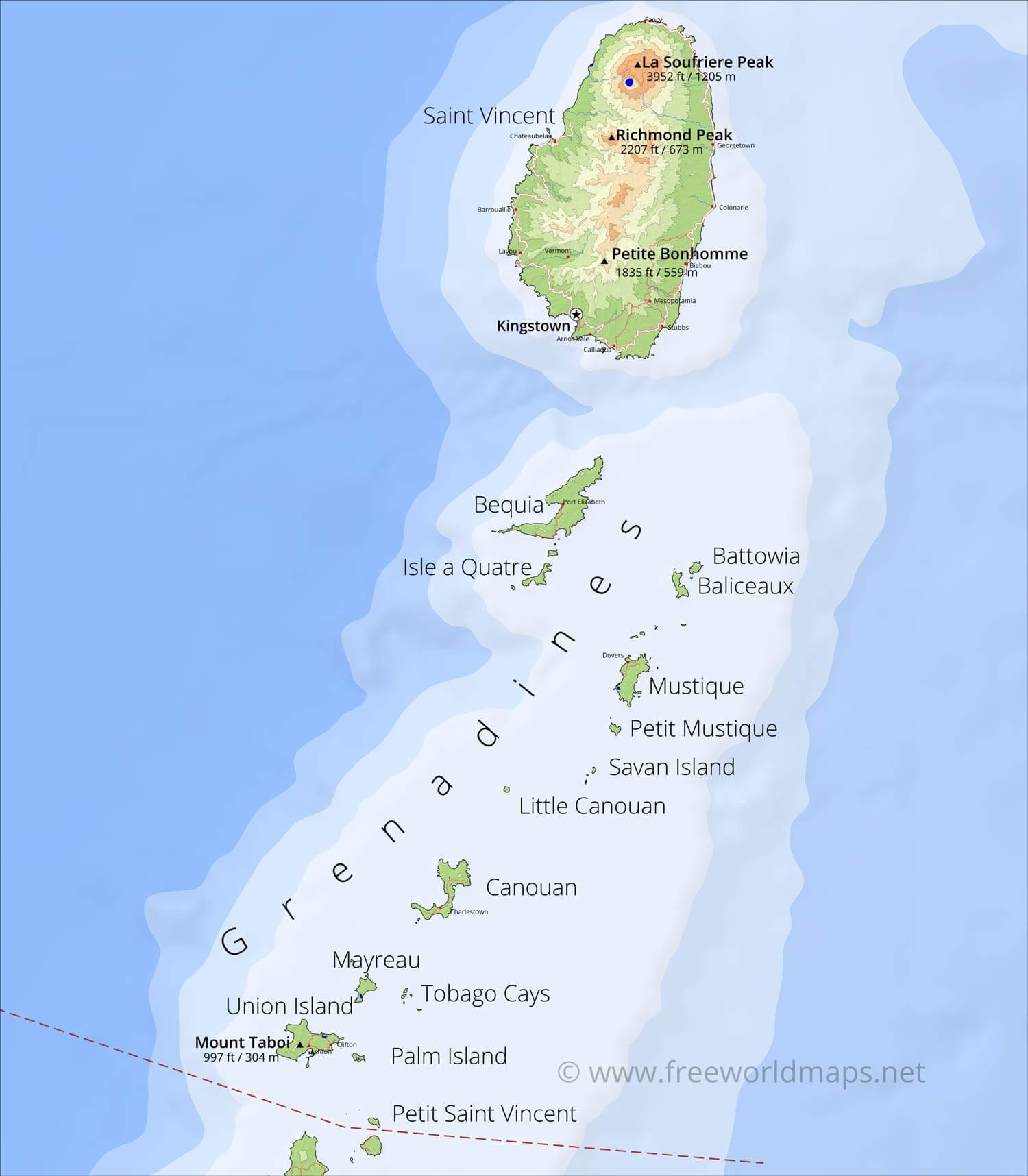 Petit Saint Vincent, Union Island, Palm Island, Mayreau, Canouan, Mustique, Bequia, Baliceaux, Battowia, Isle a Quatre, Petit Mustiqze, Saint Vincent, Grenadines, Tobago Cays, Little Canouan, Savan IslandHighest peaks (elevation):