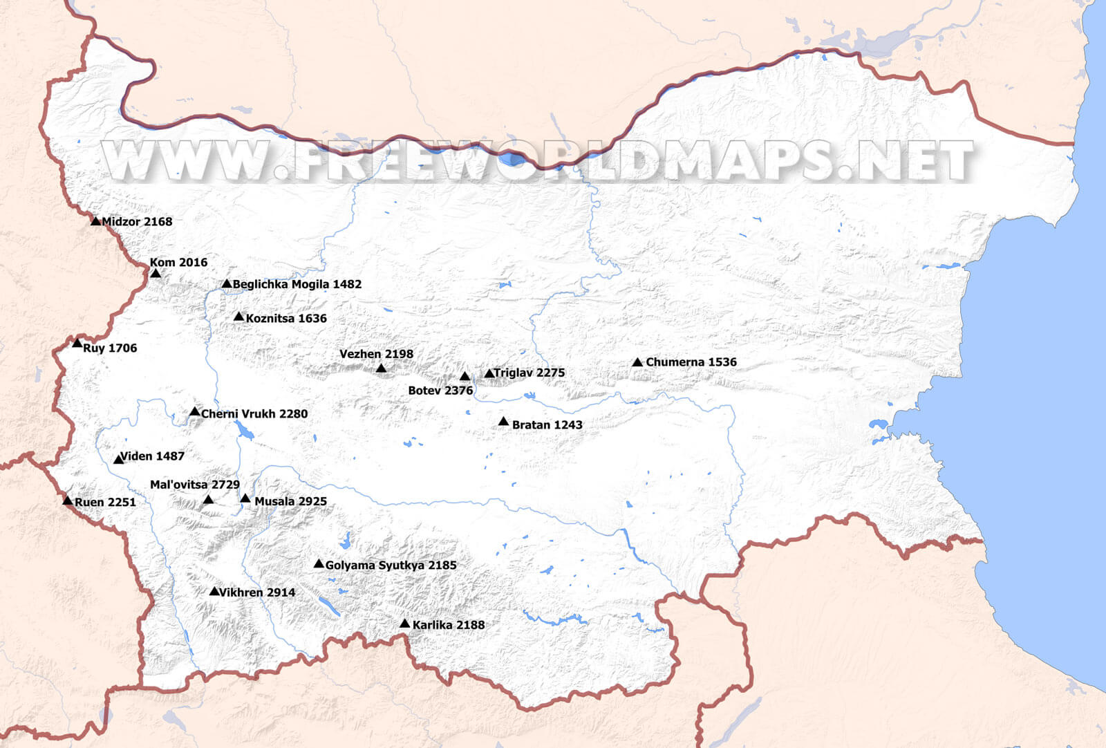 The most prominent geographical feature of Bulgaria are the two arc of mountains that chop the eastern and southern regions of the country. The Balkan Mountains is the northernmost of these, which also have an extension towards Serbia, while the Rhodope mountains reach into southern neighbour Greece. Rhodope is the highest of the two, Mount Musala almost breaks into the 3000-ers, with a height of 2925, making it the highest elevated extreme point of Bulgaria. The Balkan Mountains are considerably lower, with some of its summits concluding above 2200 meters. The maximal elevation of this range is 2376 by Peak Botev.