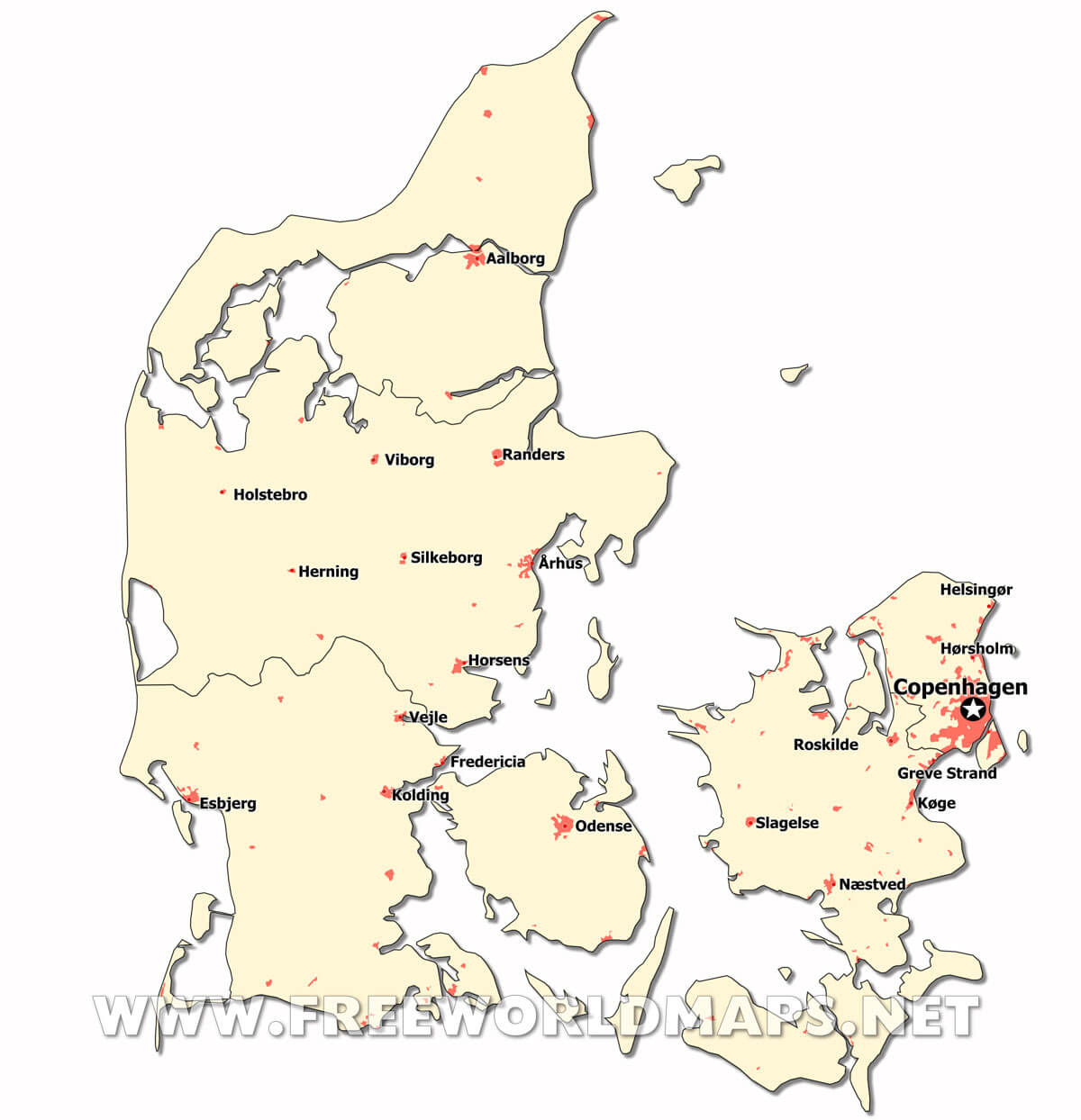 The capital and largest city is Copenhagen (Danish: København). Other major cities include: Århus, Odense, Aalborg, Kolding, Randers, Vejle, Helsingør, Herning, Silkeborg, Viborg, Holstebro,