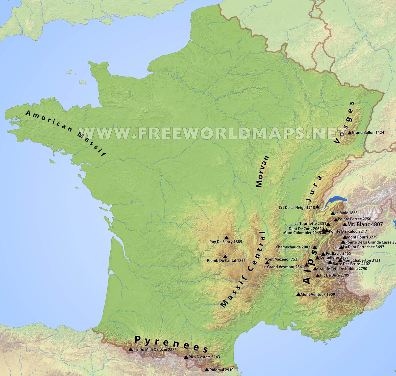 Besides the high mountain ranges of the Alps and Pyrenees, there are other notable mountain ranges, including the Massif Central a range of extinct volcanoes, the Vosges near Germany, the Jura shared with Switzerland, or the hilly Ardennes on the Belgian border. The French Alps is the home of the highest peak in Europe (excluding the Caucasus mountains) reaching 4807 meters right on the border with Italy.