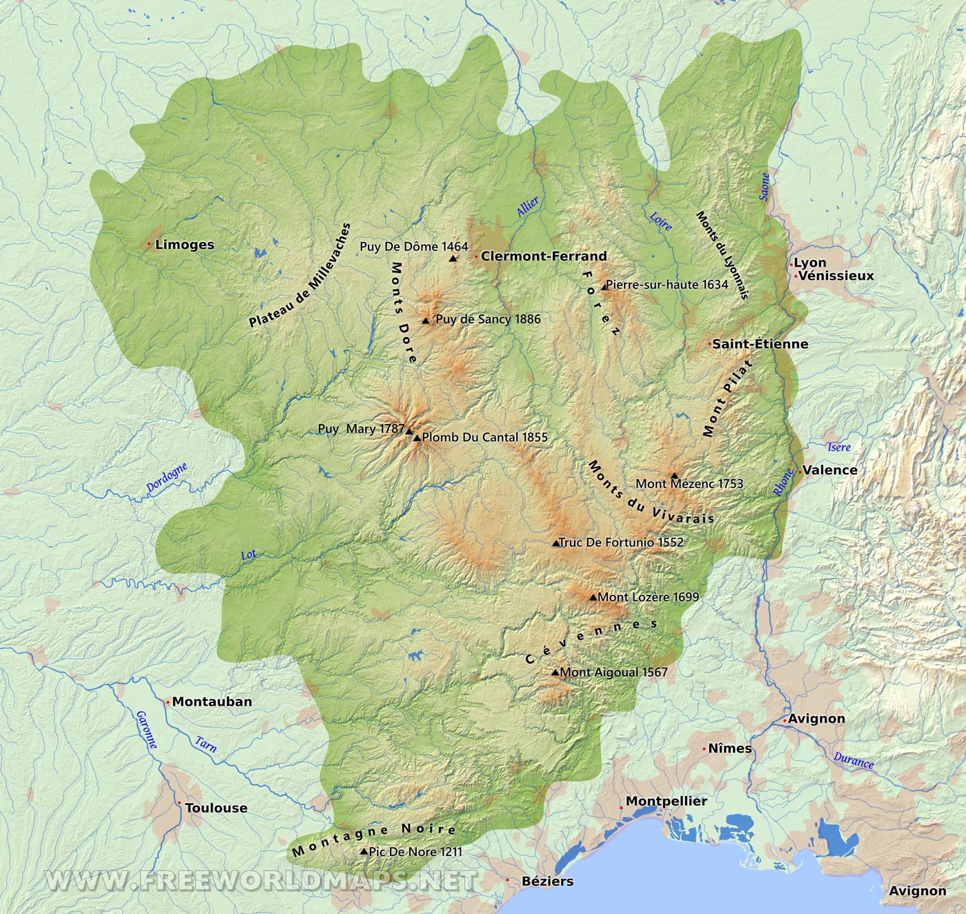Chaîne des Puys, Monts Dore, Monts du Lyonnais, Mont Pilat, Cévennes, Montagne Noire, Plateau de Millevaches, Monts du Vivarais, ForezHighest peaks of the Massif Central (with elevation):