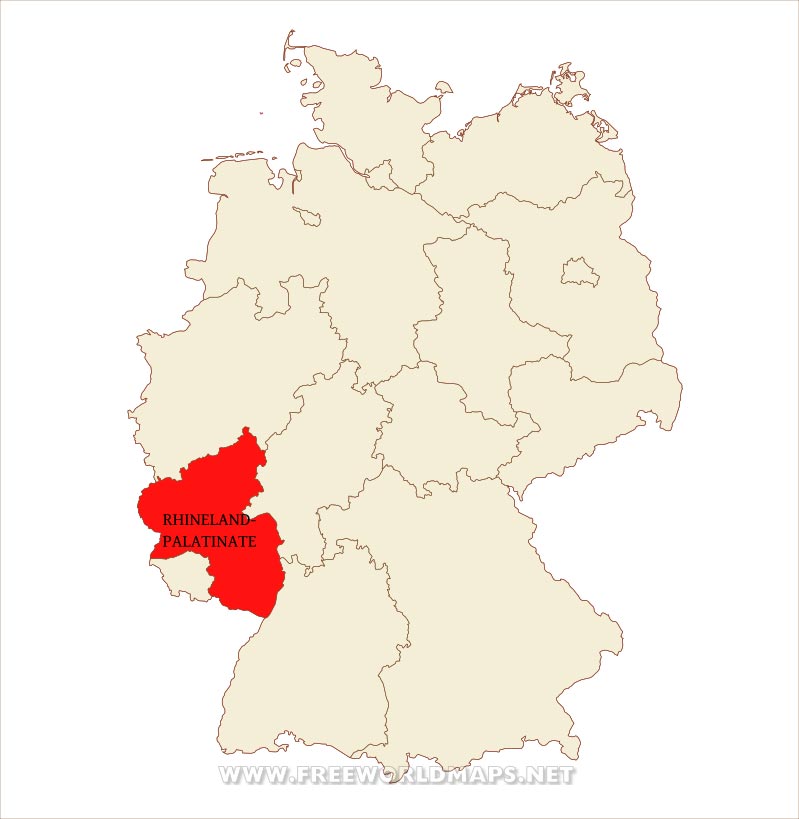 Rhineland-Palatinate is a state of Germany in the south-western corner of the country, sharing borders with the other German states of Saarland, Hesse, Baden-Württemberg, North Rhine-Westphalia, and international borders with France, Belgium and Luxembourg.