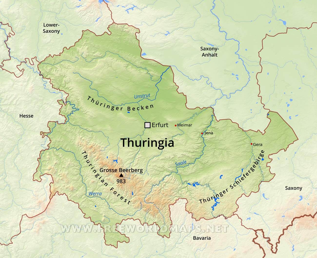 Thuringia sborders on the states of Lower Saxony, Saxony-Anhalt, Saxony, Bavaria and Hesse.