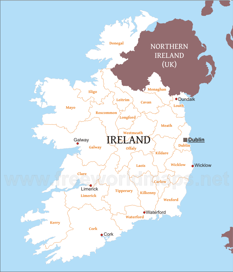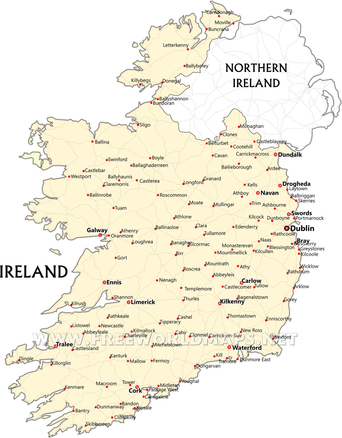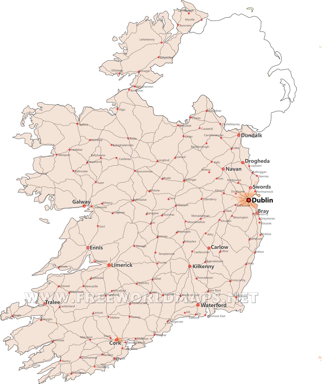 The capital and largest city is Dublin.Other major cities include: Dundalk, Wicklow, Galway, Limercik, Cork, Waterford.