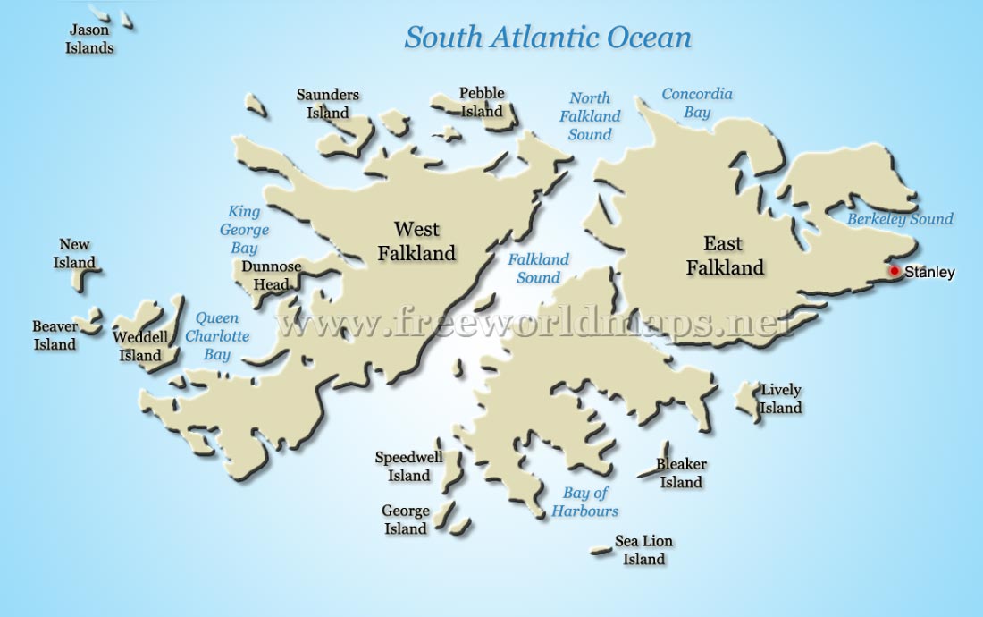 East Falkland is separated from West Falkland by the Falkland Sound, which is a narrow body of water running in approximately southwest-northeast direction between the the two main islands. The most notable mountain range on the western island is the Hornby Hills, which runs more or less parallel to the Falkland Sound coast.