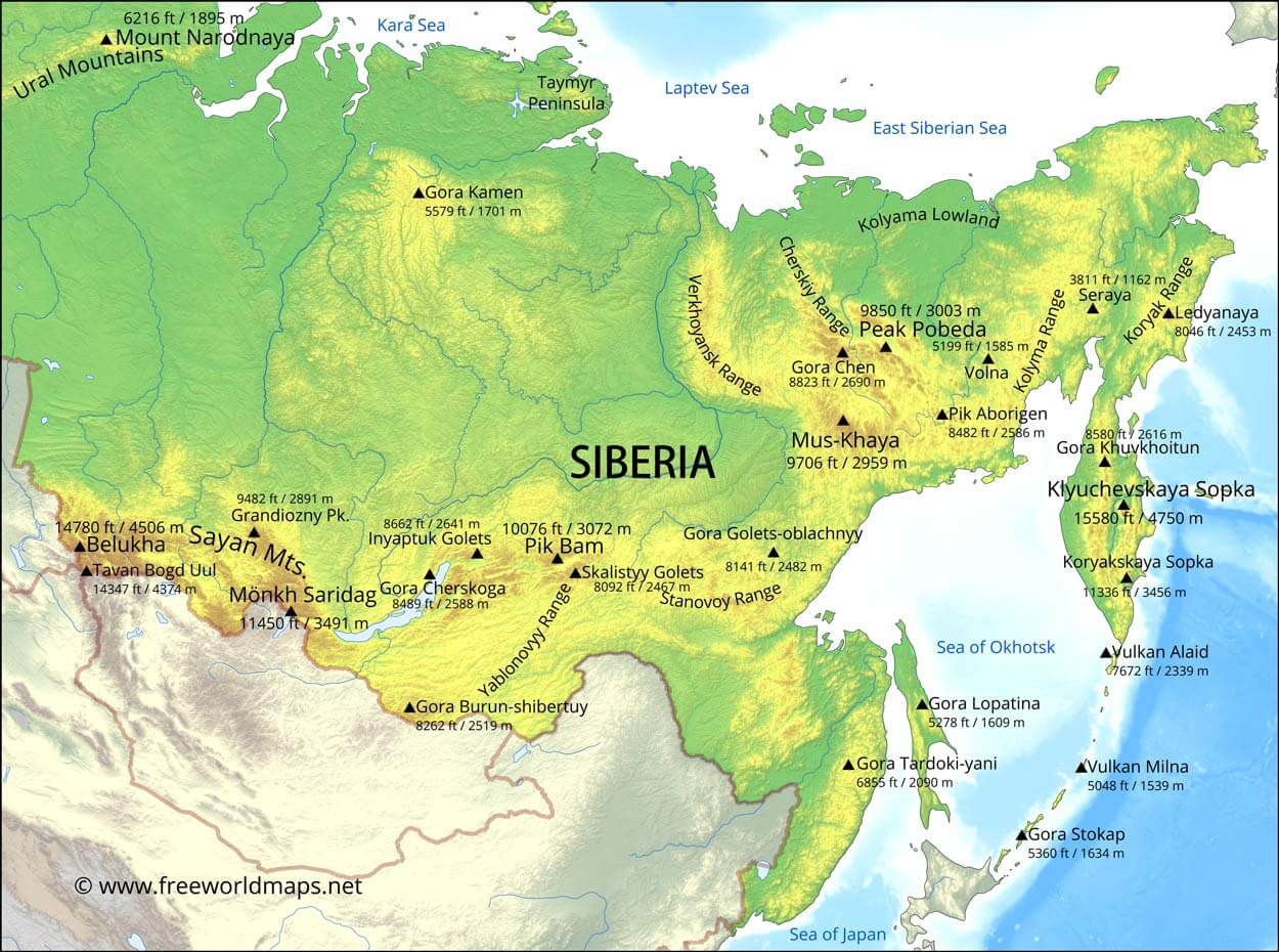 Major mountain ranges in Siberia include the Ural Mountains which also mark the western border of the region, the Altai and Saian Mountains in the south, Stanovoy Range, Kolyma Mountains, Verkhoyansk Mountains lying further on the east.