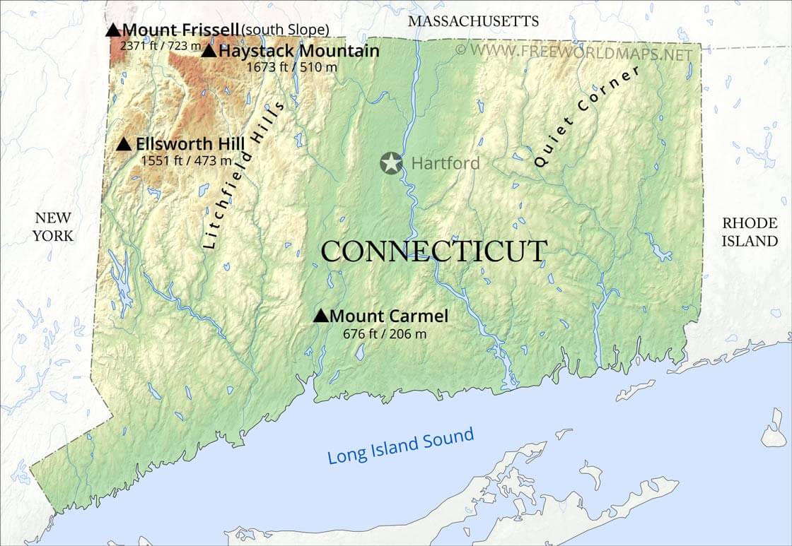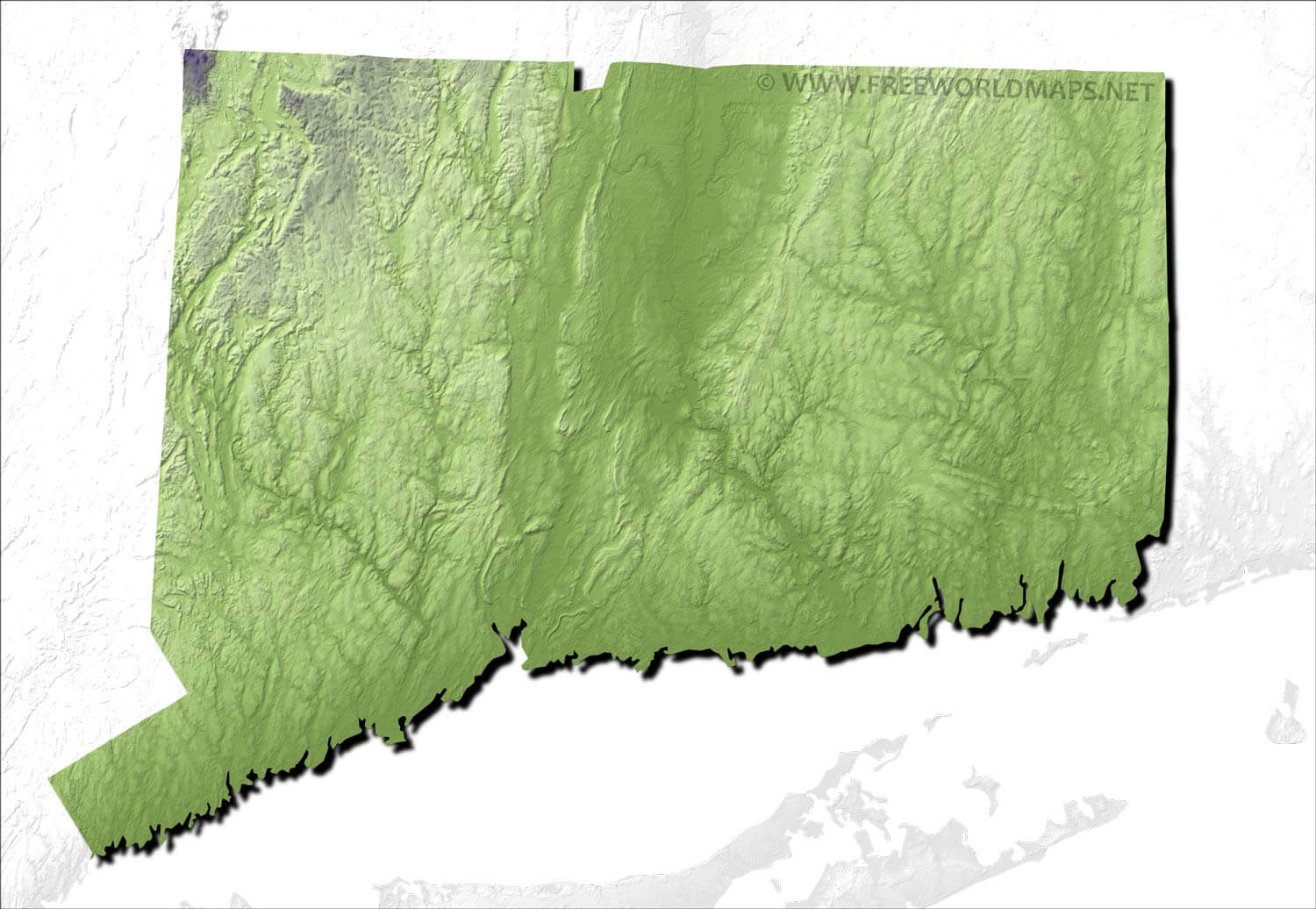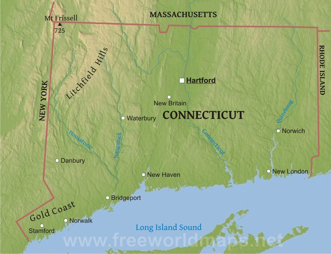 Physical map of Connecticut, mountains, lakes, rivers and other features of Connecticut