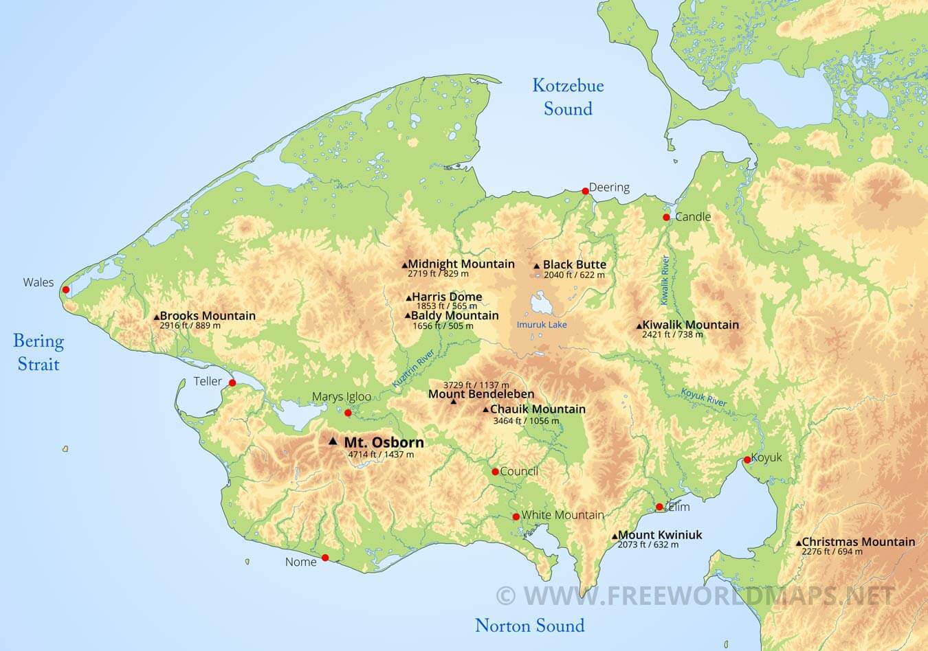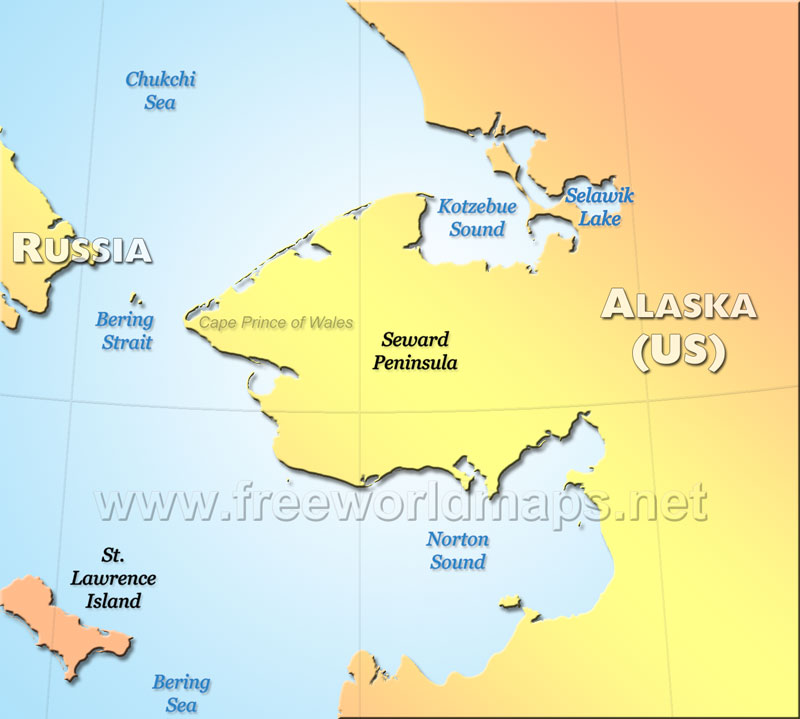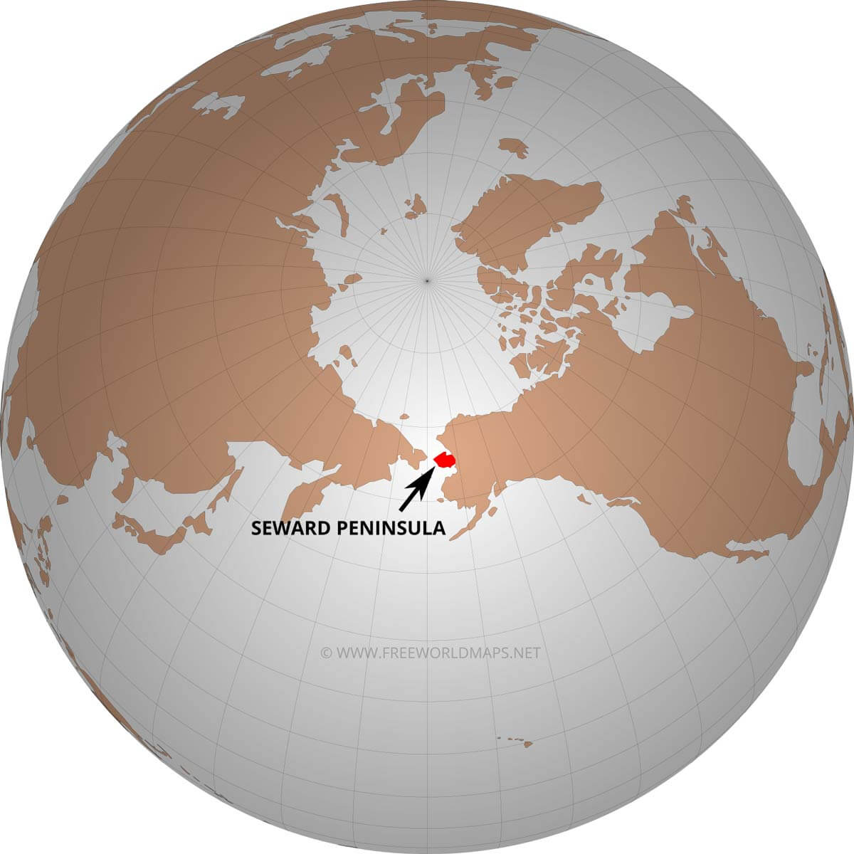 The Seward Peninsula extends to the west from the mainland of U.S. state of Alaska, reaching into the Bering Strait, lying just below the Arctic circle. It is sorrounded by the Norton Sound, the Bering Strait and the Kotzebue sound.