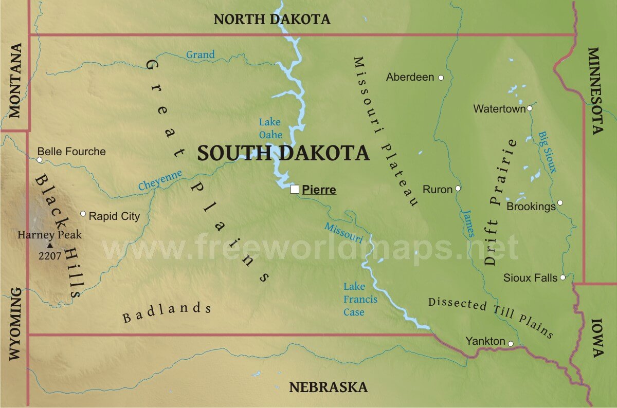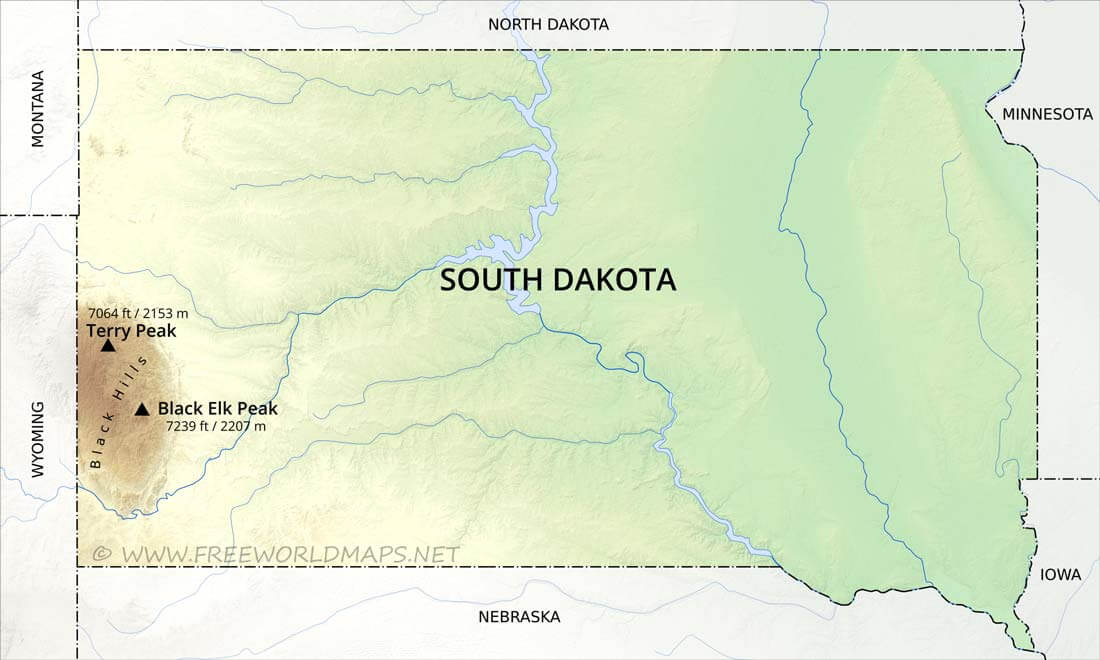 As the other states of these central regions of the country, South Dakota also rises from east towards west. The Drift Prairie, Dissected Till Plains lie in the lowest lying eastern section, the landscape gradually raises if we move towards the west. The Missouri Plateau, with the Missouri river flowing through it occupies the central parts. The highest parts of the state are to be found in the western parts, in the Black Hills, with Harney peak reaching 2207 meters.