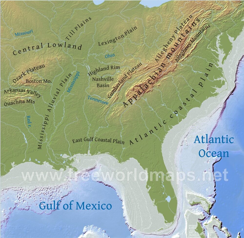 The region can be divided into four major geographical sections. The coastal plains along the Atlantic Ocean and Gulf of Mexico, the Appalachian ranges, the Mississippi Alluvial Plain, the Ozark Plateau and the surrounding plateaus, hilly parts.