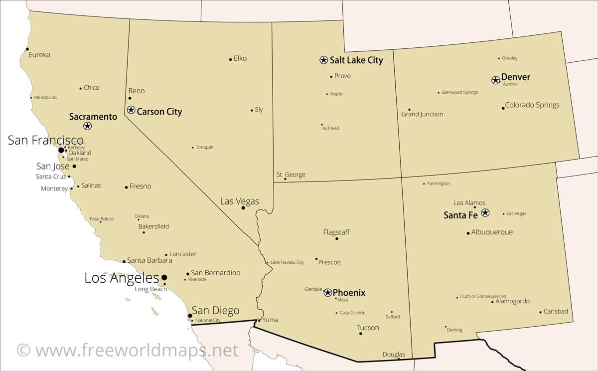 Political map of the Southwestern US, states, capitals, Interstate highways, major cities