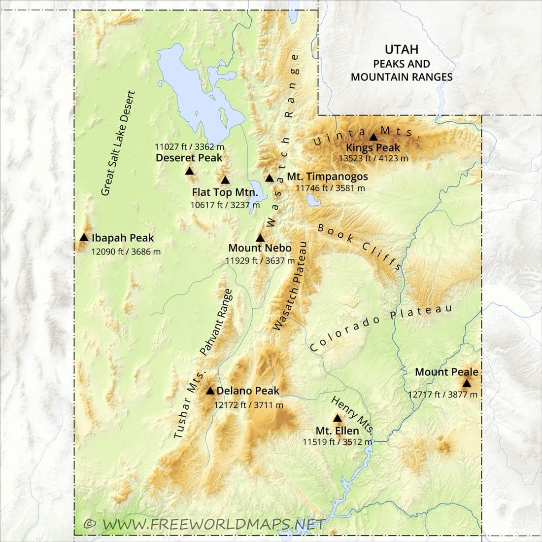 Running down the center of the state is the Wasatch Range, which rises to heights of about 3650 meters above sea level. In the northeastern section of the state, running east to west, are the Uinta Mountains, which rise to heights of 3962 meters or more.
