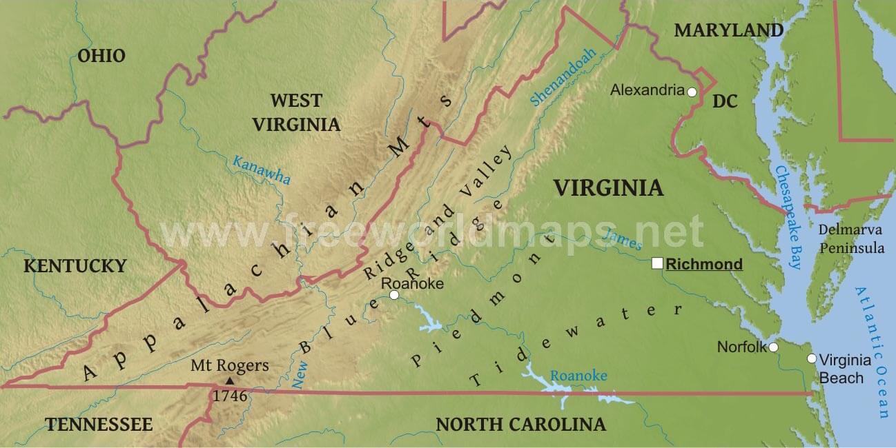 The main characteristics of the western regions is the Appalachian Mountain chains, and its smaller ranges that run in a northeastern directions from the southwestern corner of the state. The terrain is gradually changed to flat plains in the east, the Atlantic Coastal Plains, that is bisected by many rivers, amongst which the Roanoke and the James rivers are of highest importance. The southern corner of the Delmarva Peninsula also belongs to Virginia, being separated form the mainland by the Chesapeake Bay.